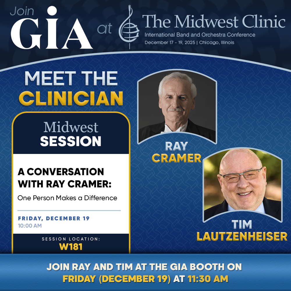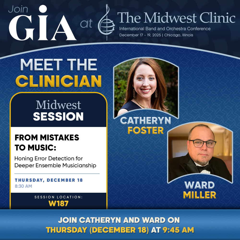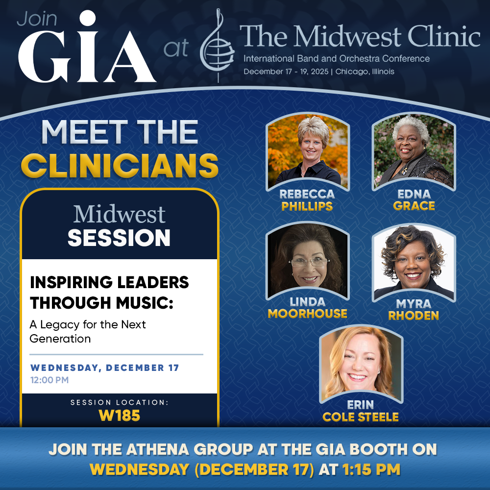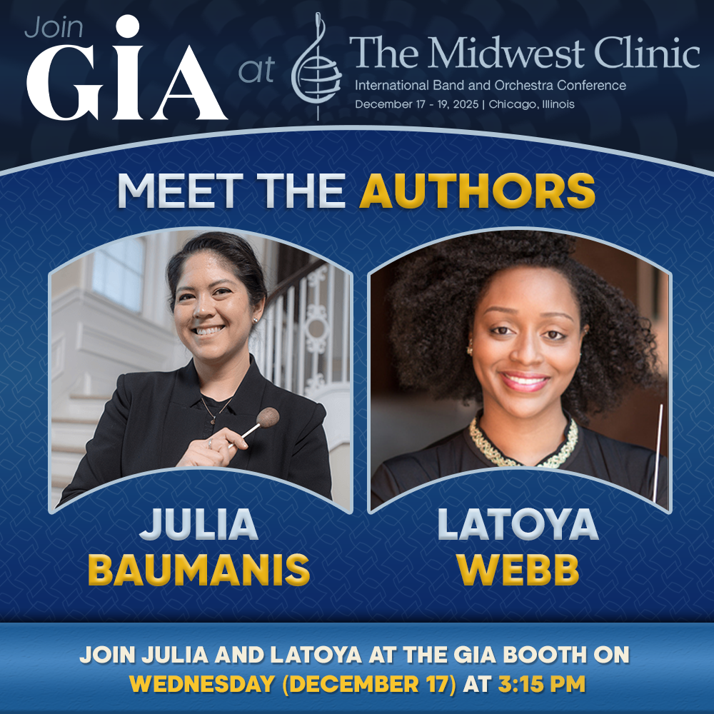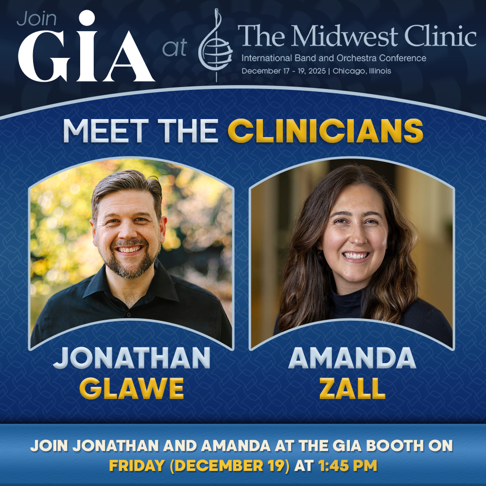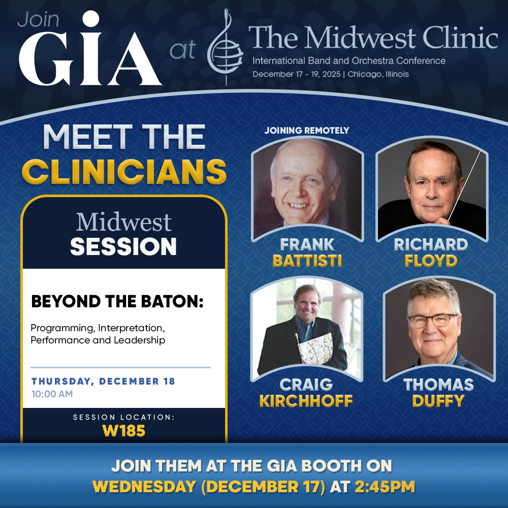 GIA is proud to support and sponsor an amazing vareity of music education professionals at this year's Midwest Band Clinc. If you plan on attending, be sure to stop by the GIA Booth to explore our new 2025 releases and for your chance to meet our clinicians. Dates and times for each session and meet-and-greet are listed below.