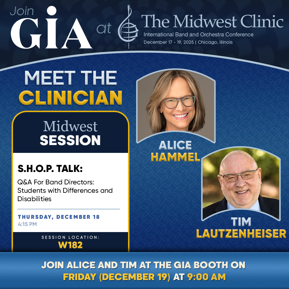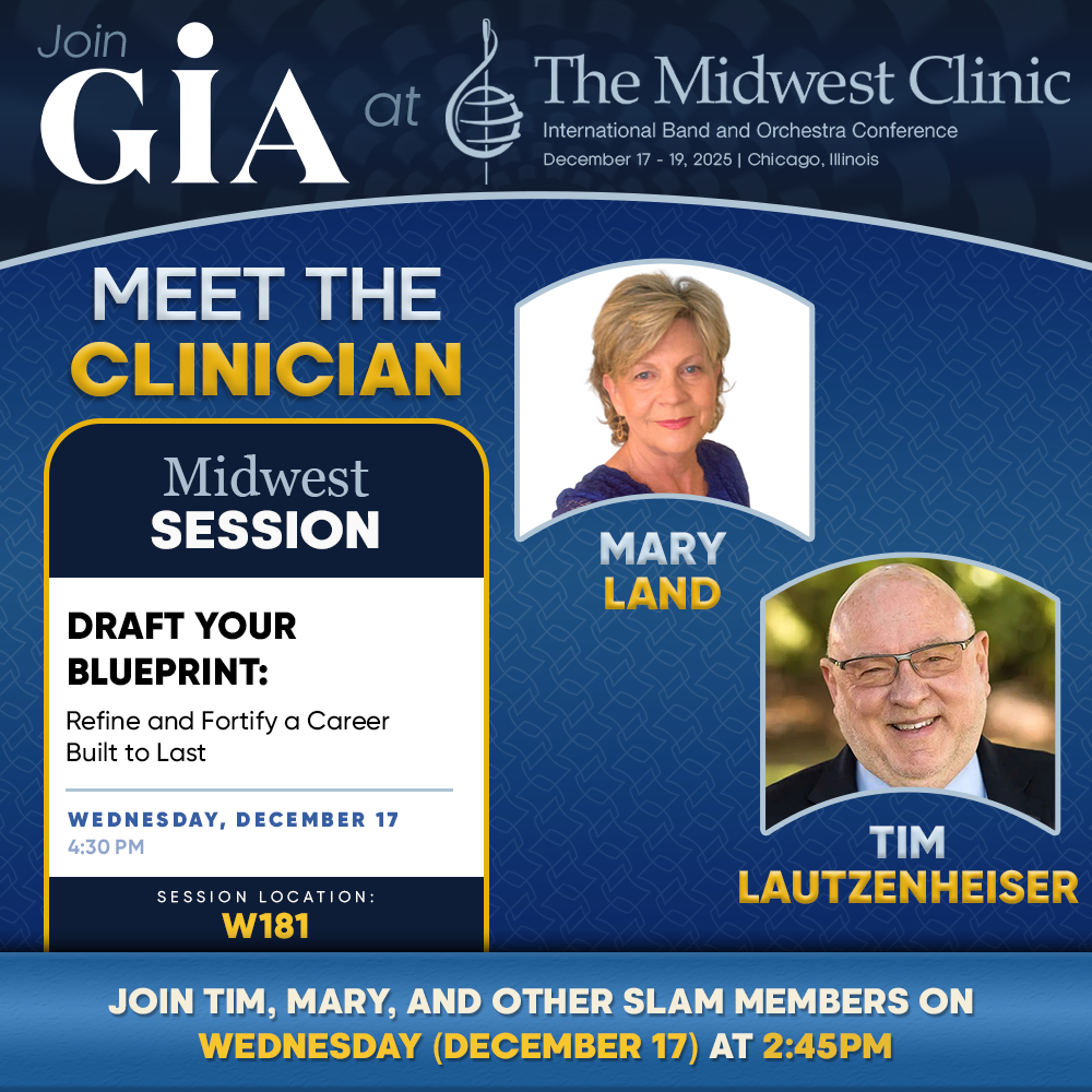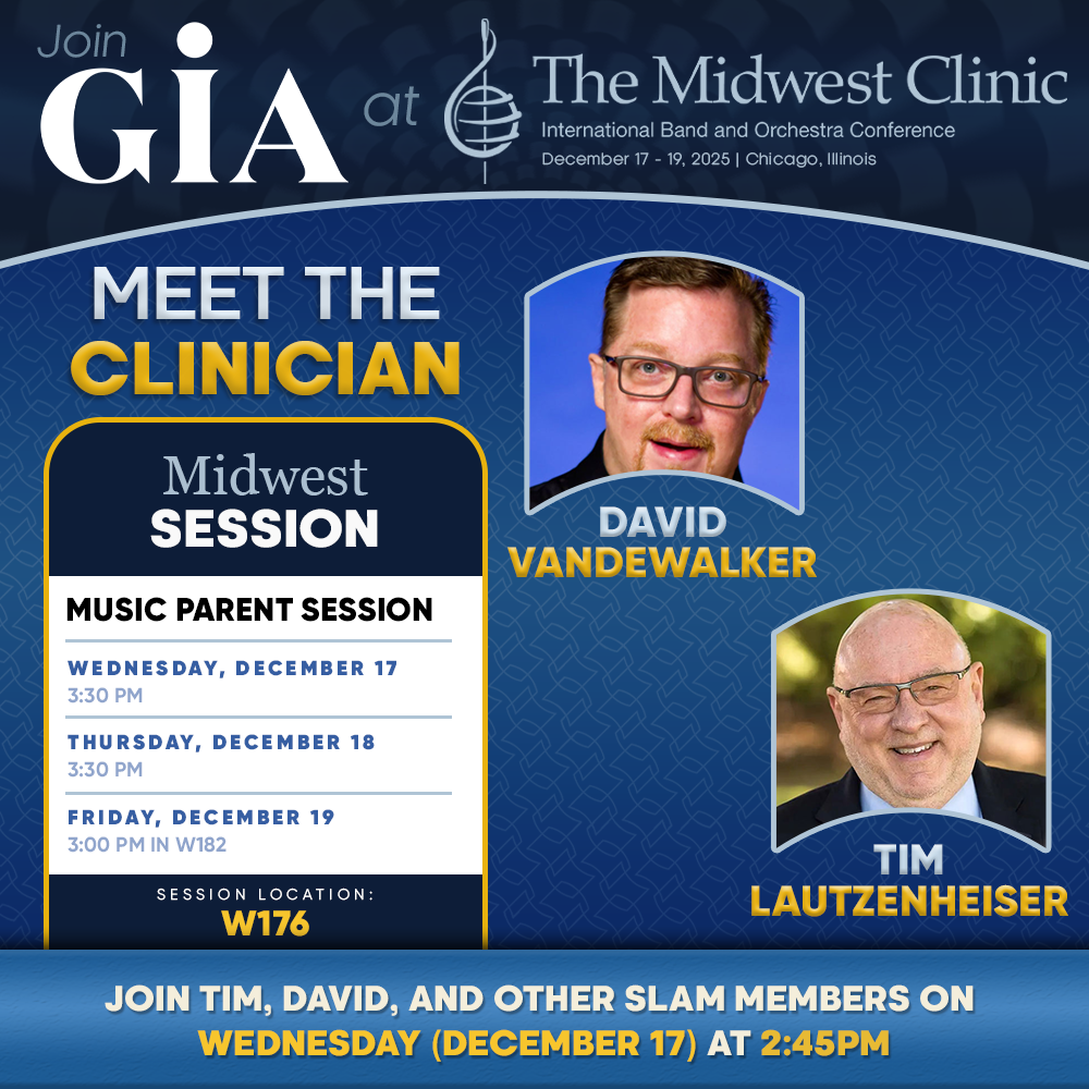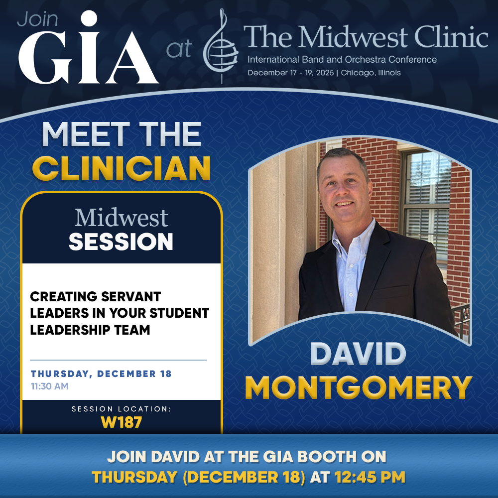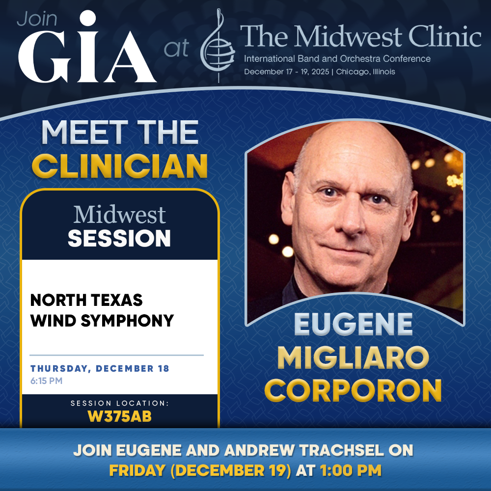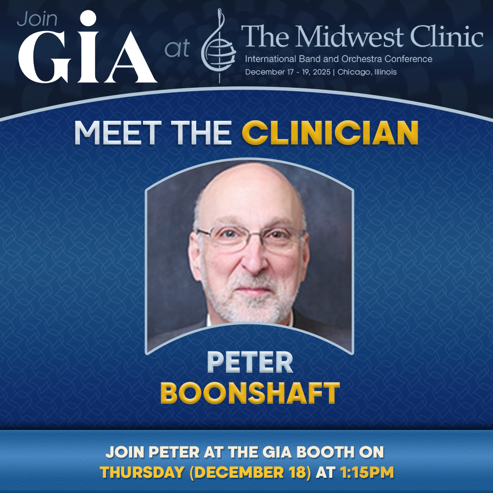 GIA is proud to support and sponsor an amazing vareity of music education professionals at this year's Midwest Band Clinc. If you plan on attending, be sure to stop by the GIA Booth to explore our new 2025 releases and for your chance to meet our clinicians. Dates and times for each session and meet-and-greet are listed below.
