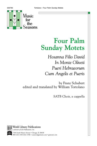 With over six hundred songs ( Lieder.) to his name, Franz Schubert was one fo the most prolific and gifted composers of the genre who ever lived. His wonderful sense of beautiful melody pervades much of his music--symphonic, stage and opera, choral, chamber, and piano solos and duets. A devout Catholic and former Vienna Boys Choir singer, he composed six Latin settings of the Mass as well as settings of the Salve Regina, Tantum Ergo., and numerous other works. Schubert's Antiphons for Palm Sunday., Opus 113, are a set of four easy liturgical motets for a cappella .choir. A singable English translation is provided with the original Latin. The four Gregorian chant compositions for the same Sunday are also provided in Latin and English. Hosanna Filio David .is sung for the blessing of the palms. The responsory In Monte Oliveti .can be sung between the Epistle reading and the Gospel, followed by Pueri Hebraeorum .for the distribution of the palms and Cum Angelis. for the procession of the palms.--Dr. William Tortolano